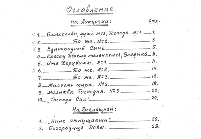 Над Всенощным бдением и Божественной Литургией он работал многие годы. На одном из нотных листов есть запись: «Херувимские № 2 и № 3 посвящаю дорогим моим о. Григорию и сестре Нине Сергеевне Пономаревым. К Херувимской № 3 "Июнь, 1963 год. (редакц. 1969 года; первые три такта – редакц. 1986 г.)".