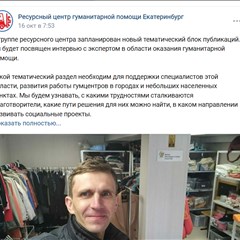 Одна из задач проекта - развитие работы гуманитарных центров в регионе. С этой целью сотрудники ресурсного центра в октябре 2022 года организовали 2 поездки в Белоярский и Сысертский район и провели инструктаж для специалистов проектов в области оказания гумпомощи. 18-19 октября 2022 года команда центра познакомилась с деятельностью гумцентра Фонда Алексея Новожилова, а также посетила Единый пункт сбора гуманитарной помощи для того, чтобы исключить дублирование в работе. В 2023 году планируется выпуск справочника, где будут собраны данные по всем проектам в области оказания гумпомощи региона.