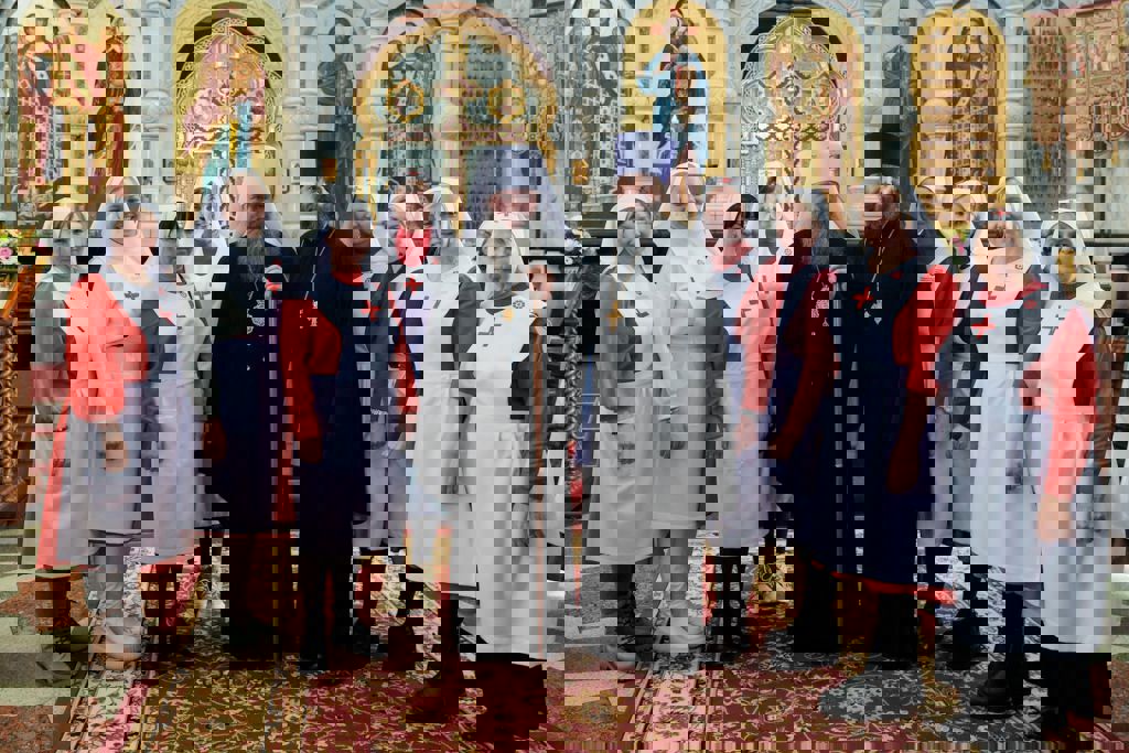 На фото: после посвящения в сестры милосердия с митрополитом Евгением и священником Евгением Попиченко, Храм-на-Крови, ноябрь 2023 год.