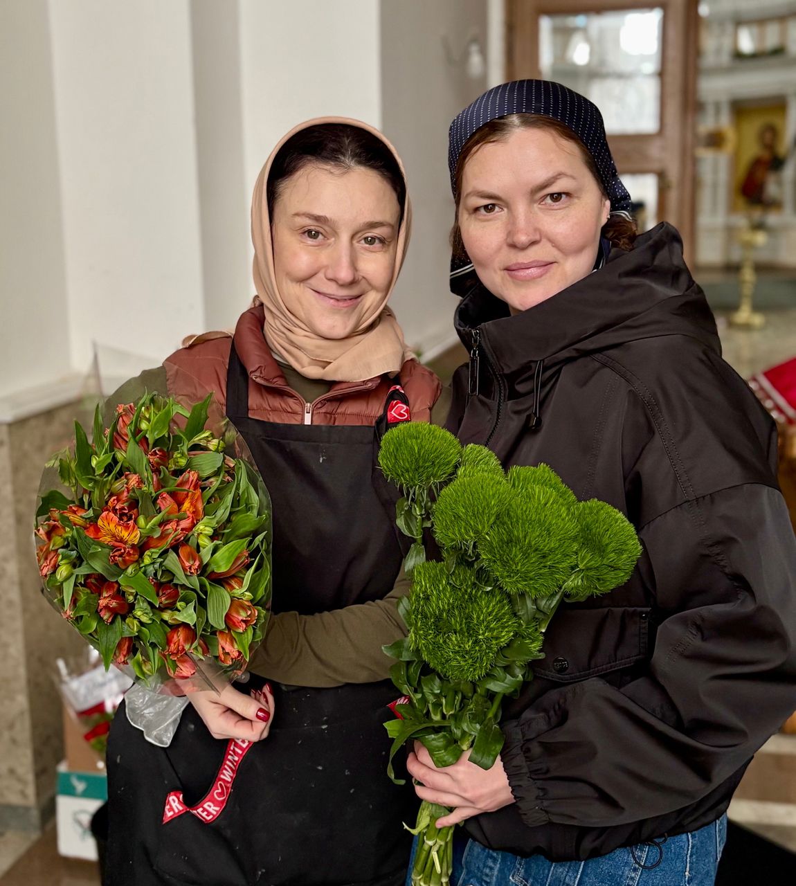 Флористы усердно трудились над созданием красоты в Успенском соборе. Каждый день с утра до вечера 8 человек работали над украшением, создавая атмосферу праздника Пасхи.